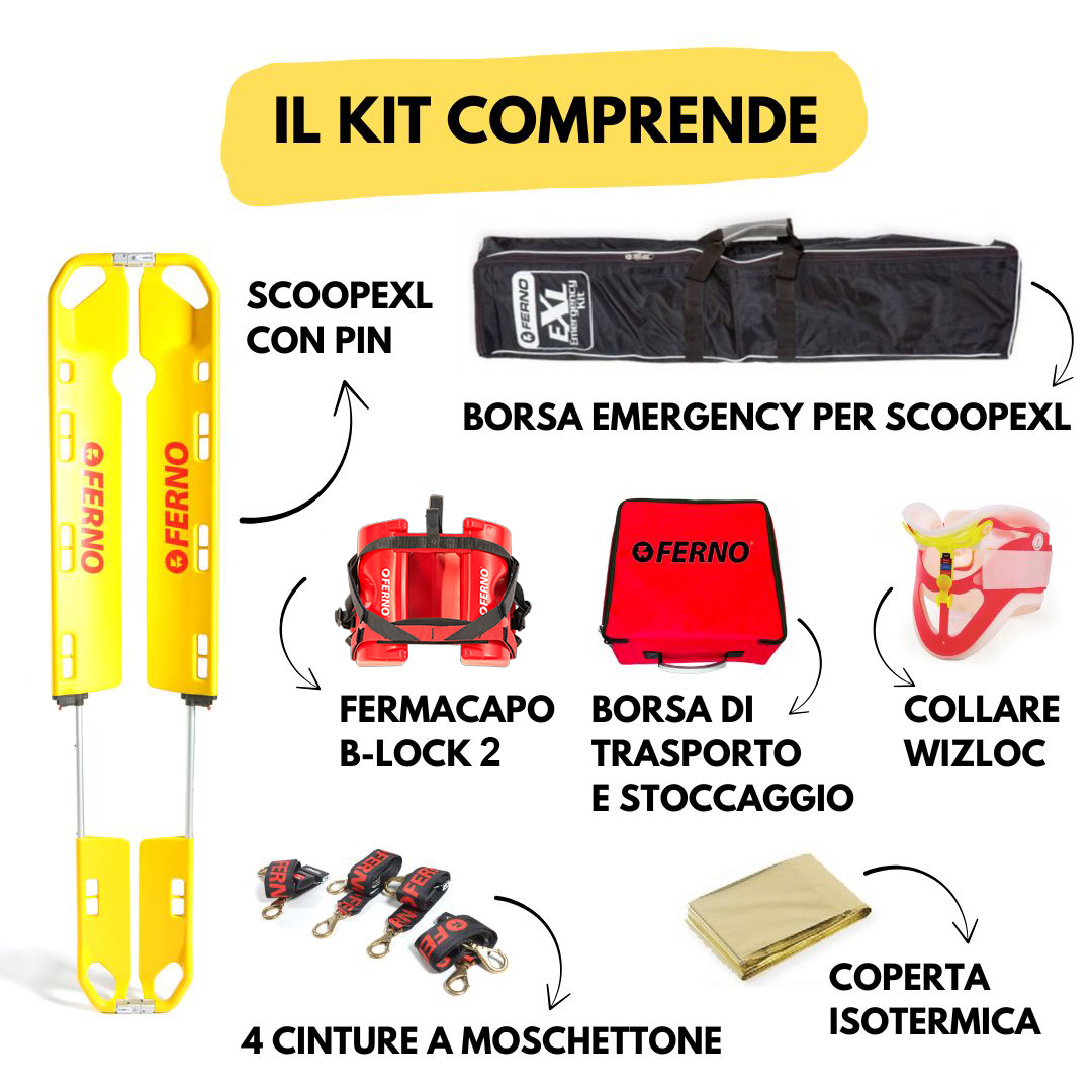 Emergency Kit è l'equipaggiamento che abbiamo pensato per te, per i soccorsi con la barella ScoopEXL. Agevola le operazioni di soccorso perché hai con te tutti i presidi necessari per l'immobilizzazione.
